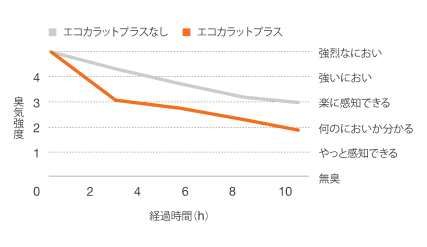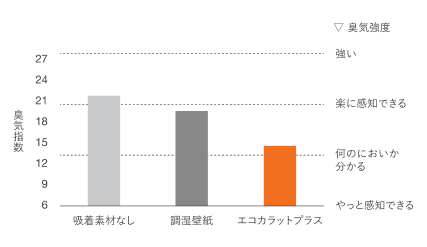 ※試験体90mm角をにおい袋27Lに入れ、ペット模擬臭を封入し、室温下で2時間放置します。 ※試験体は予め湿度65%で恒量化。臭気を三点比較式臭袋法による嗅覚測定にて臭気指数を測定。 ※臭気強度は、予め求めた臭気指数との相関値で表示 ※大同大学共同研究結果 ※部屋の使用条件、気象・換気などの環境条件によって異なります。