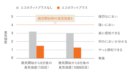 ※エコカラットプラスを施工した部屋と施工していない部屋(各6畳)で、400gの牛肉を調理。時間ごとの臭気を官能試験で評価しました。エコカラットプラスの施工面積は5.4㎡です。 ※臭気強度:臭気の強さを6段階に分け、0から5までの数値で表す手法。 ※試験結果は当社試験によるものです。部屋の使用条件、気象・換気などの環境条件によって異なります。
