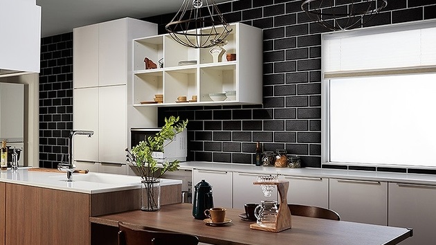 写真のように壁一面をタイルにすれば、派手になりすぎず、イメージチェンジができますね。部分的に張って、インテリアのアクセントにしてもよいでしょう。モダンな雰囲気にしたいのなら黒やグレーなどのダークカラー、清潔感を出したいのなら白色がおすすめです。