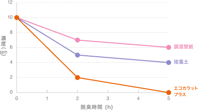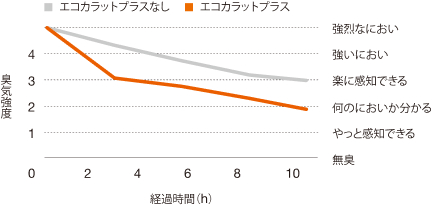 エコカラットプラスを施工した部屋と施工していない部屋2部屋(各6畳)を用い、それぞれホットプレートで、400gの牛肉を調理。時間ごとの臭気をセンサー計測し、官能試験での評価を実施しました。エコカラットプラスの施工面積は5.4㎡です。