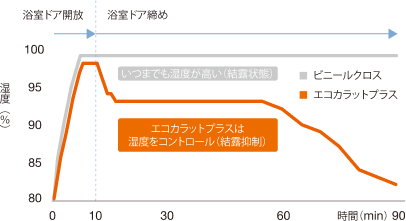 浴室にてシャワーを使用後、浴室ドアを開け10分間放置(脱衣所に湿気が移行する状態にした)。脱衣所(室温12°C)に湿度センサーを設置し、締め切った状態(湿度が外部に逃げていかない状態)で湿度経過を測定しました。エコカラットプラスは、脱衣所4.9m³に対して、4.9m²施工しました。